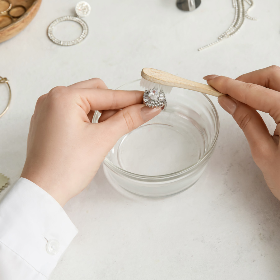 I diamanti e la maggior parte delle gemme può essere pulita in modo molto semplice, utilizzando una ciotola con acqua calda, poche gocce di sapone per piatti delicato e uno spazzolino da denti pulito con setole ultra morbide. Dopo aver spazzolato delicatamente il gioiello, risciacqualo in un bicchiere d’acqua calda per rimuovere i residui di sapone. Non risciacquare mai direttamente nel lavandino poiché rischieresti di perdere pietre allentate o persino l’intero gioiello. Per asciugare, tampona gentilmente con un panno privo di lanugine.