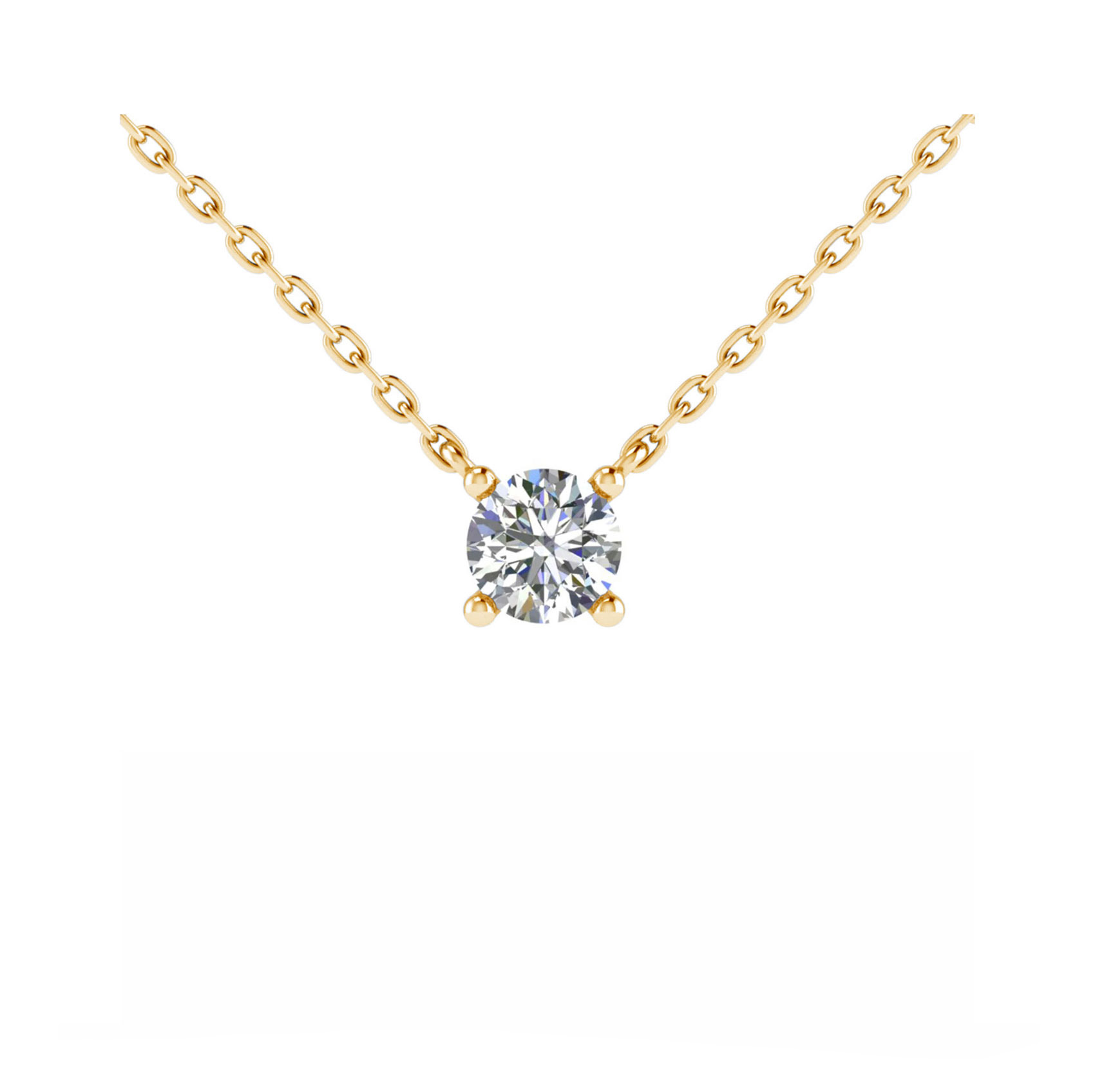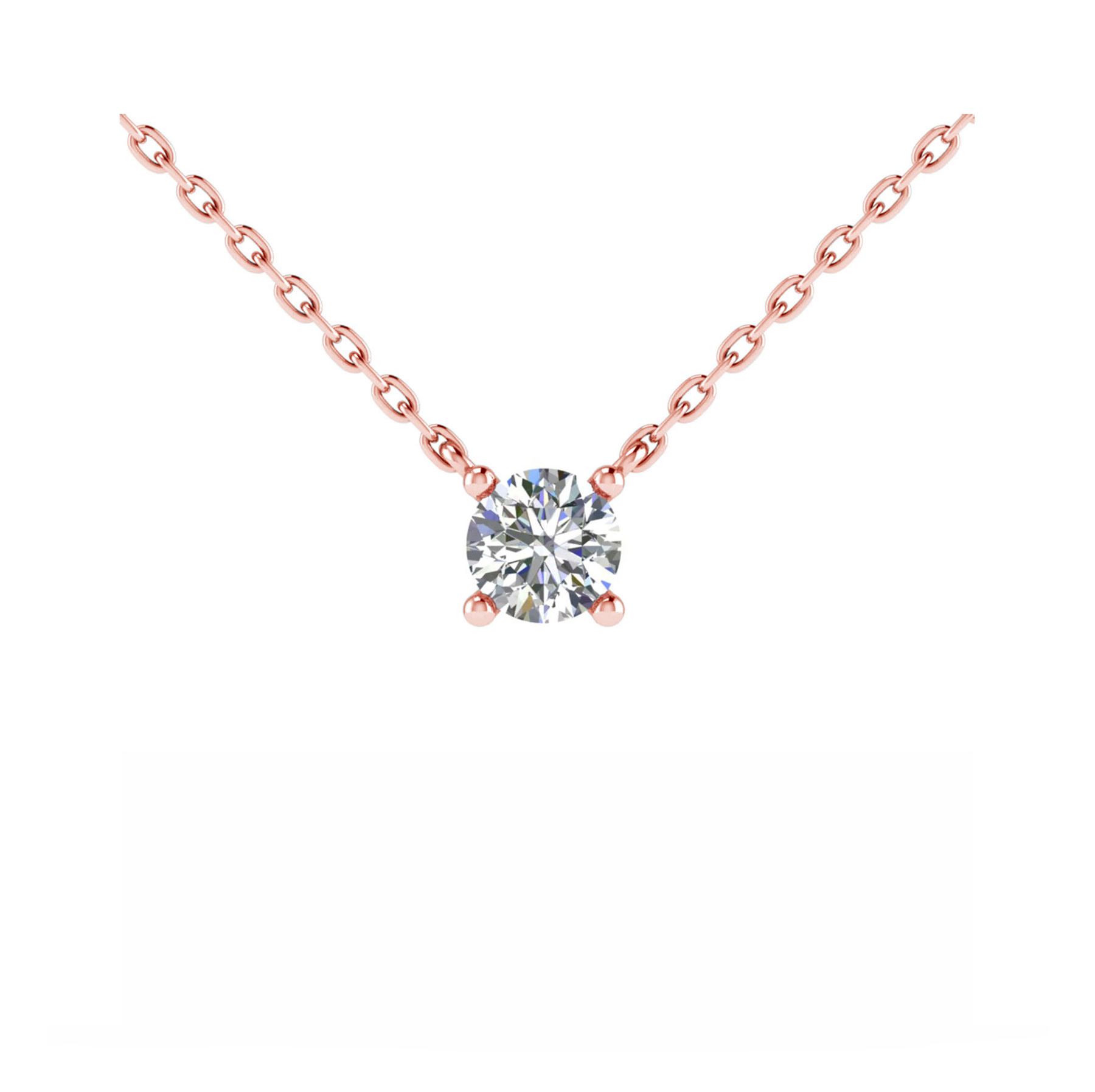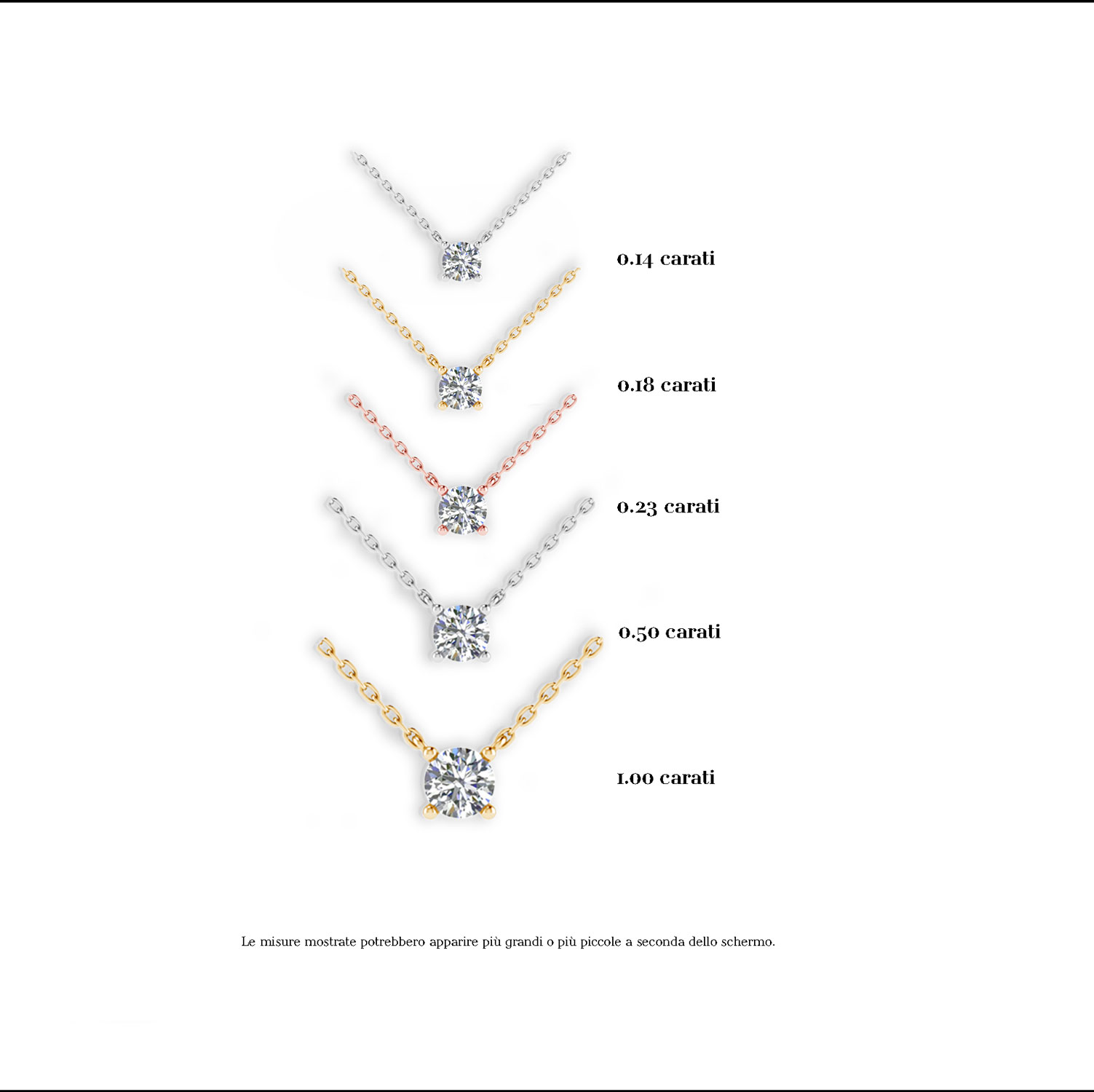 Collana punto luce con diamante solitario naturale tondo taglio brillante certificato IGI Anversa. Montatura a quattro griffe e catena realizzabile in oro 18 k bianco, giallo o rosa.