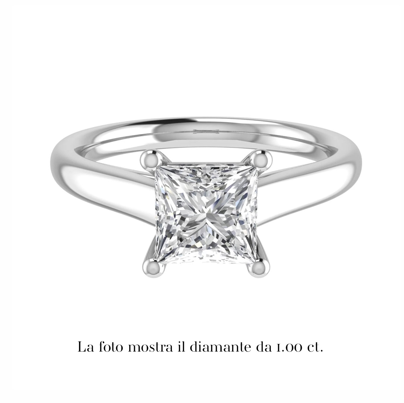 Anello con diamante solitario naturale, taglio Princess, certificato IGI Anversa. Montatura a quattro griffe in platino e fascia realizzabile in oro 18 k bianco, giallo o rosa.